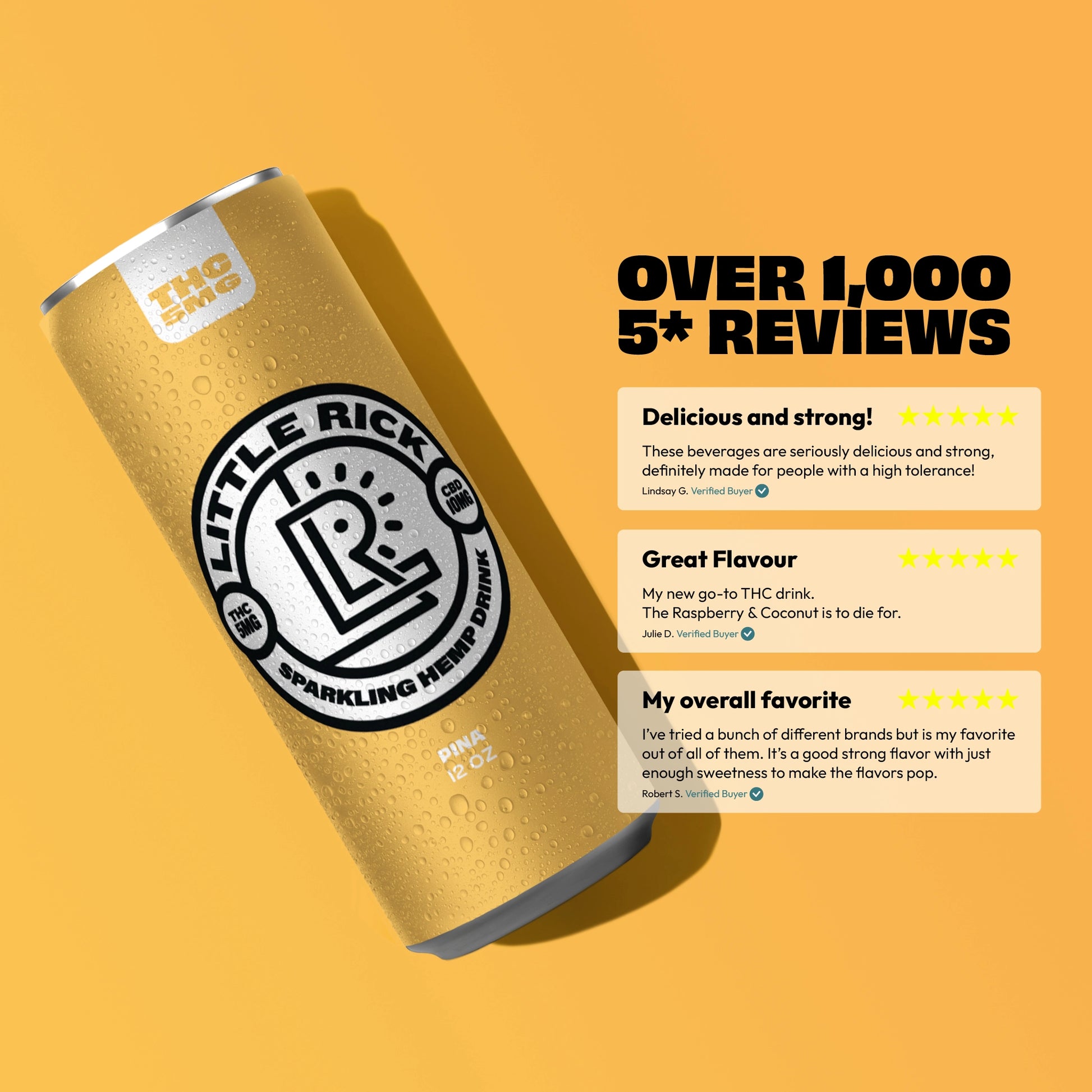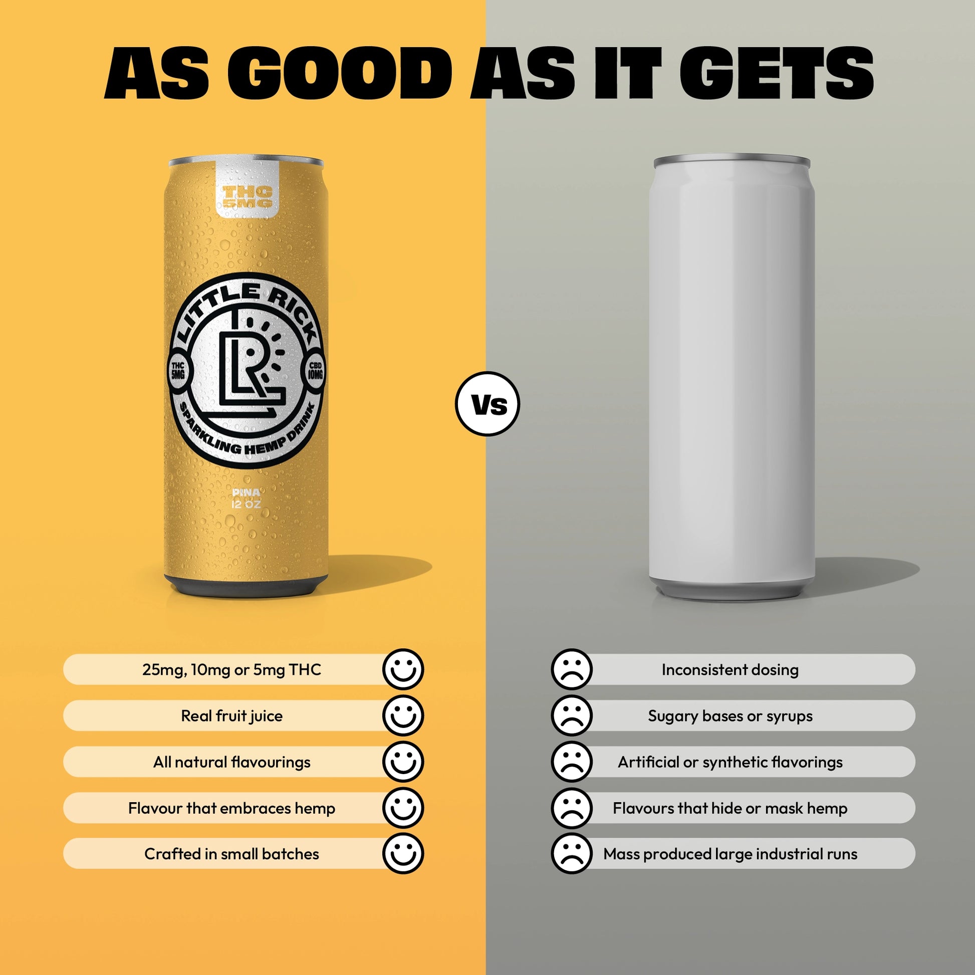 Little Rick is carefully formulated with mood-lifting cannabinoids and functional ingredients. Our blend of Delta-9 THC, CBD, CBG, CBC, taurine, and natural terpenes is designed to help you feel calm, present, and relaxed — not just refreshed. Taurine is included to help smooth out any unwanted side effects and support a more balanced experience. It’s a drink with a purpose: to help you switch off and unwind, naturally.